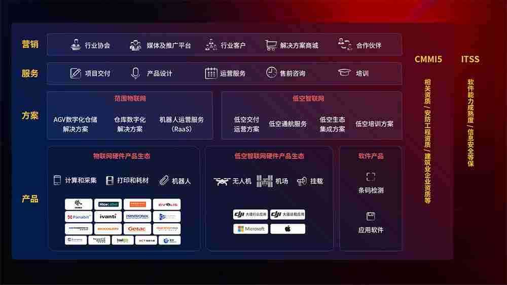 聚合国内外先进的物联网硬件产品品牌,,,,聚焦数字化仓储、、、、机器人运营、、低空智联网等领域,,,,共同打造适合客户业务场景的解决方案并提供交付服务