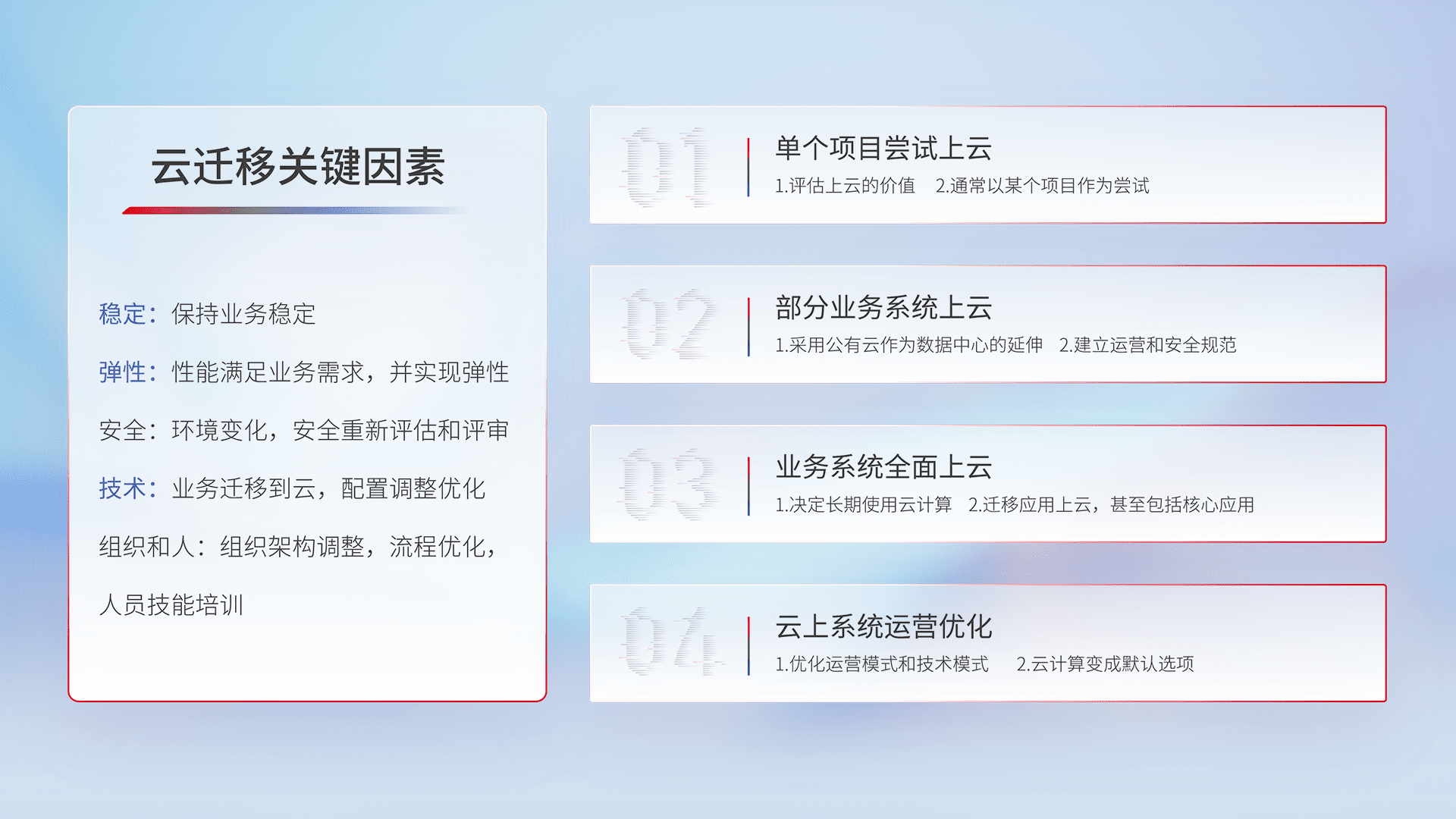 结合实际业务,,,从规划设计、、云平台选型、、、、云原生改造、、、数据迁移、、、、集成交付,,迁移全过程为客户识别最佳上云路径,,做好风险识别管理,,,,设计网络架构、、、、身份权限、、、、安全审计合规、、、操作审计、、、、日志审计、、、监控告警策略、、多站点容灾设计等,,对云上基础设施进行整体规划,,,,提升IT治理水平,,,,以满足弹性、、高可用、、高性能的需求。。。